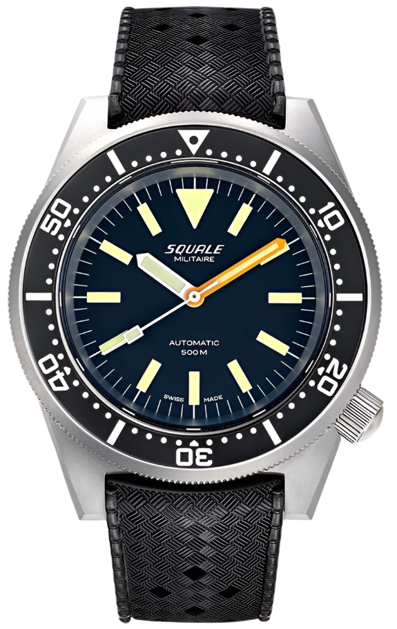 Squale Watch 1521 Militaire Steel Blasted Rubber 1521MILBL.HT. Since the 1950s, the name Squale and the classic Shark logo, Squale translates to Shark, have come to mean one thing, professional dive watches. Squale introduced their first 1000m dive watch with a unique crystal on flexible mountings that didn not use or need a Helium release valve. Squale started to supply the elite corps of a large number of armed forces.