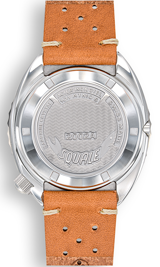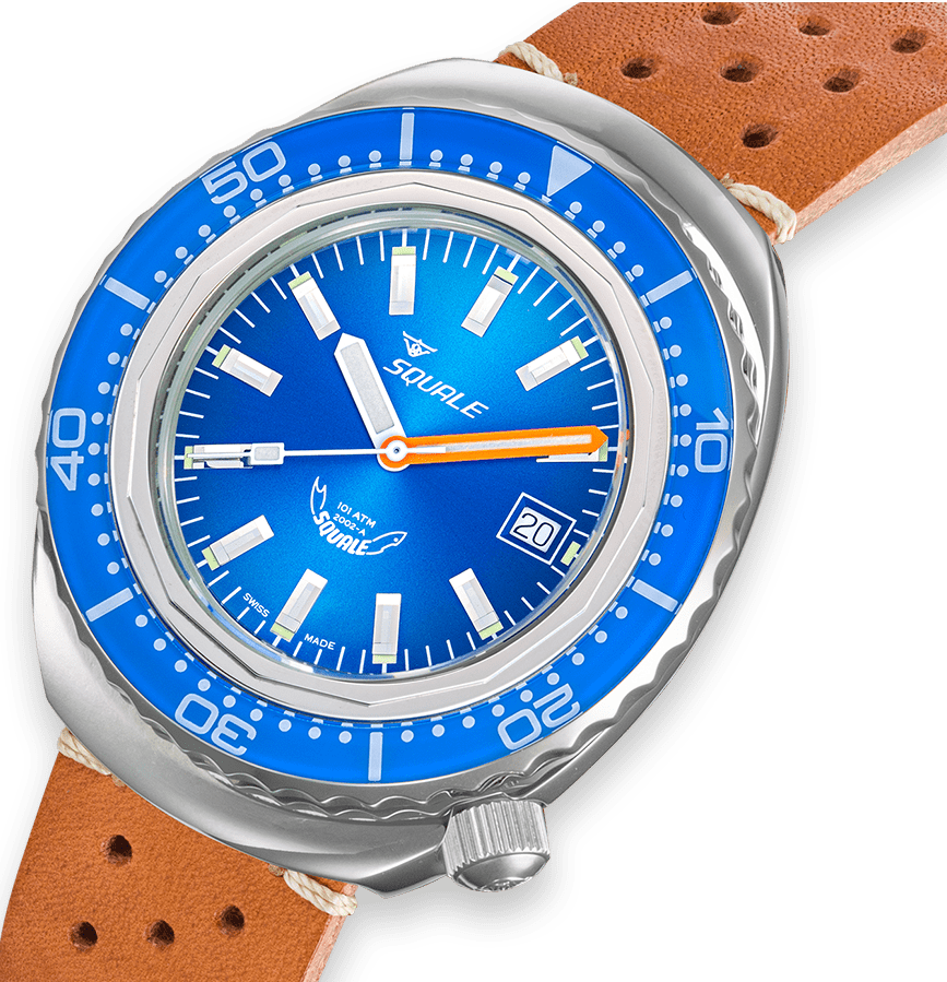 Squale Watch 2002 Blue Leather 2002.SS.BL.BL.PTC. Since the 1950s, the name Squale and the classic Shark logo, Squale translates to Shark, have come to mean one thing, professional dive watches. Squale introduced their first 1000m dive watch with a unique crystal on flexible mountings that didn not use or need a Helium release valve. Squale started to supply the elite corps of a large number of armed forces.