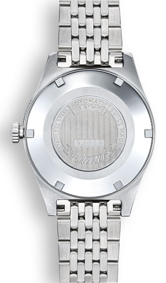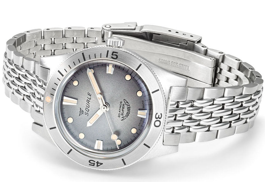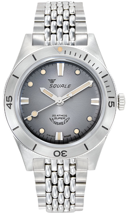 Squale Watch Supersquale Sunray Grey Bracelet SUPERSSG.AC. Since the 1950s, the name Squale and the classic Shark logo, Squale translates to Shark, have come to mean one thing, professional dive watches. Squale introduced their first 1000m dive watch with a unique crystal on flexible mountings that did not use or need a Helium release valve. Squale started to supply the elite corps of a large number of armed forces.