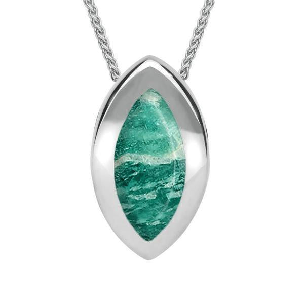 An elegant marquise shaped pendant of Amazonite set in sterling silver stands subtly off the chest, allowing for the sterling silver 18 inch chain it is presented on enough room to pass through the sides at the top of the pendant, leaving no need for a bail. This creativity gives a unique and more contemporary look.