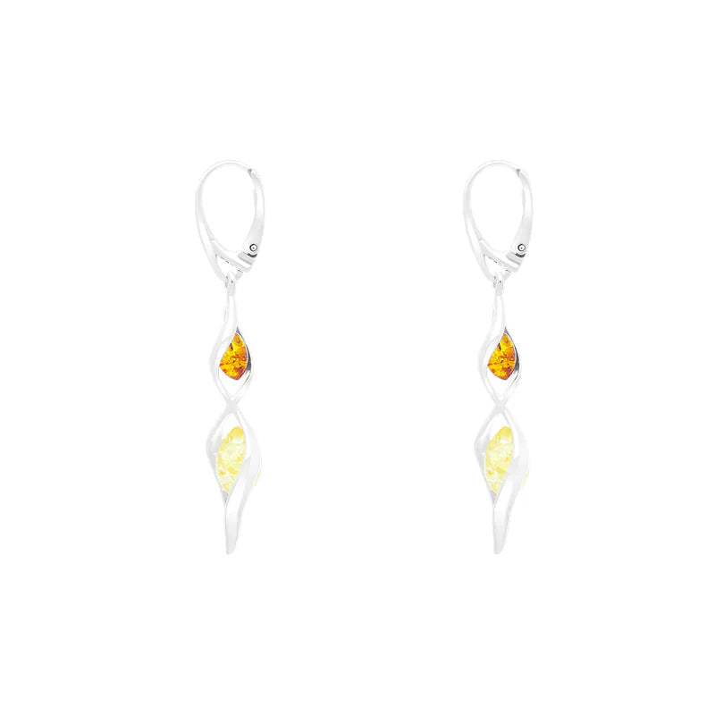 These sleek, elegant earrings have been hand crafted within our workshop by our expert jewellery craftsmen.They feature two amber gemstones of orange and yellow, held in place by twists of beautifully crafted sterling silver. These earrings are secured by a silver lever back hook fastening.