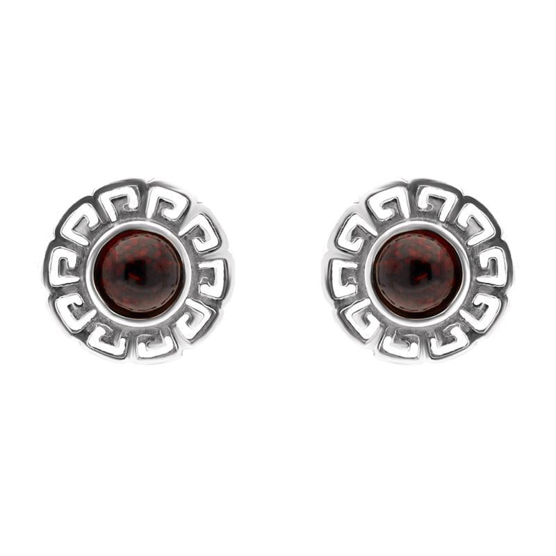 These simple stud earrings feature a sterling silver pierced frame, taking inspiration from Grecian patterns and a deep red, central Amber gemstone. Sold complete with sterling silver butterfly and post fastening. Dimensions: 9mm x 9mm, Amber; 4mm x 4mm.