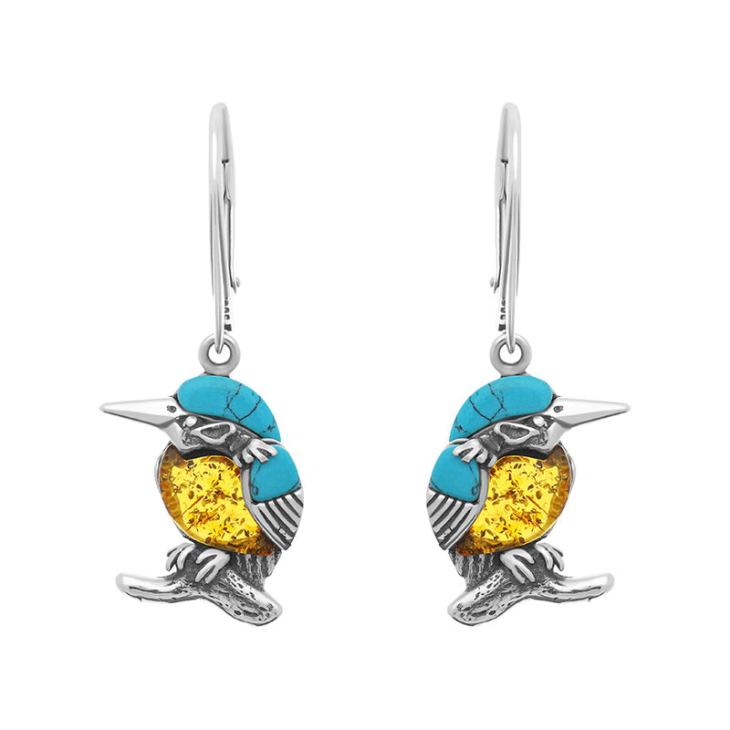 These beautiful kingfisher drop earrings are made using solid sterling silver and the highest quality Baltic amber and reconstituted Turquoise. The transparency of the Amber creates a lovely orange glow as the light passes through the body of the bird. The perfect gift for nature lovers. The earrings are completed by lever-back hook fastenings for easy wear.