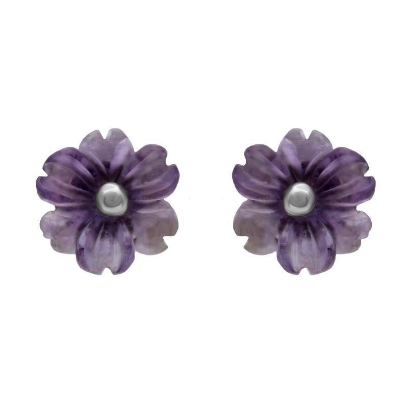 These feminine earrings are part of our Tuberose handmade jewellery collection and feature exquisite hand crafted pieces of Amethyst. The gemstones have been cut and carved in a unique and detailed dahlia design, to showcase the natural beauty of the Amethyst, which is set within sterling silver settings. The earrings are completed with post and butterfly fastenings, for secure everyday wear.