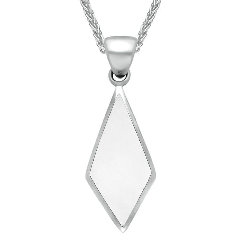 A stylish and feminine pendant. Hand carved and polished to a reflective smooth finish, an elongated diamond shaped Bauxite gemstone is set into sterling silver, and is solidly backed. Presented on an 18 inch sterling silver chain, through a bail which is attached to the drop with a tiny link at the top point.