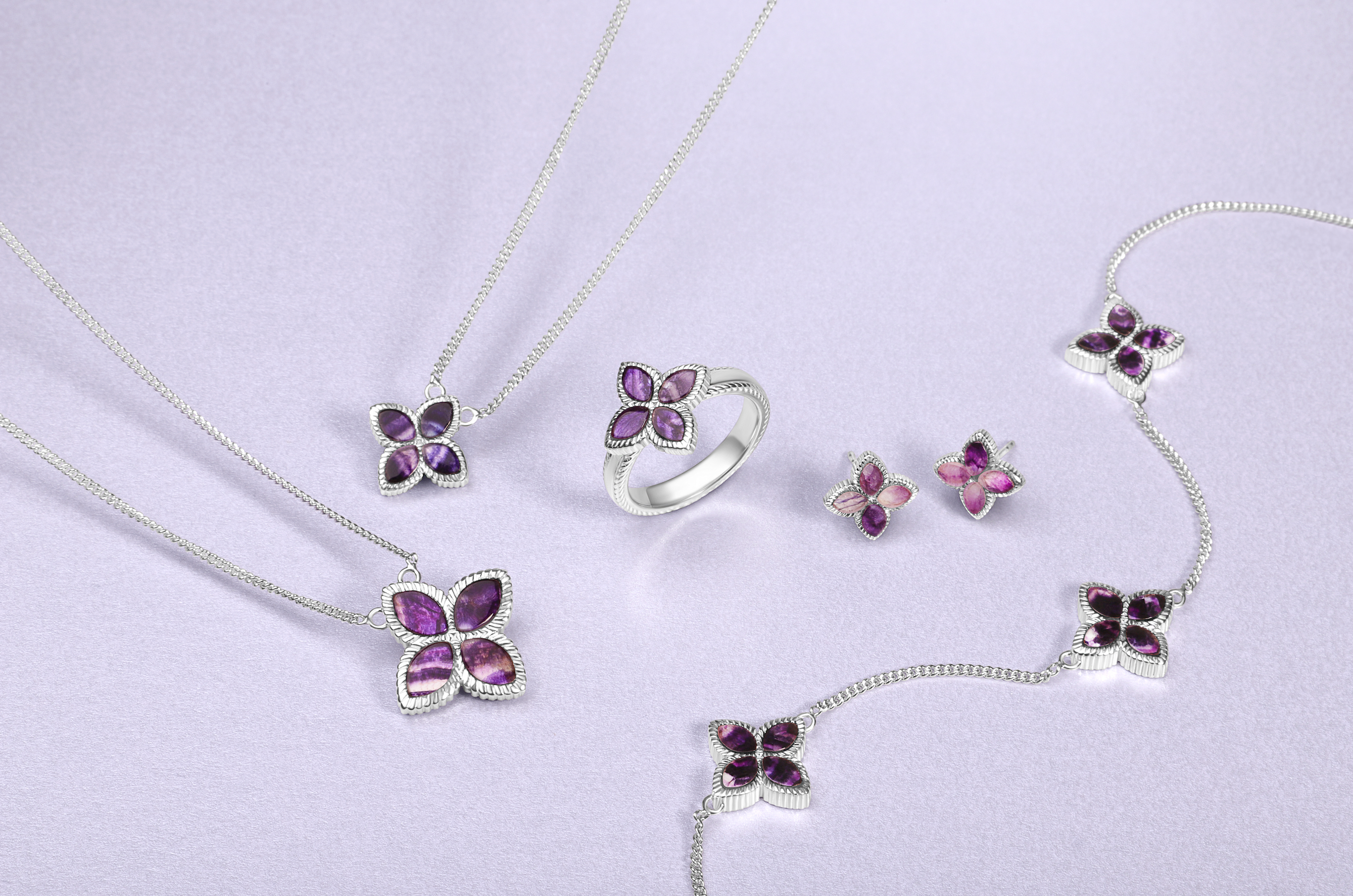 This elegant bracelet features twelve stunning marquise shaped cabochons of the finest Blue John stone in the shape of 3 flowers, sourced directly from Derbyshire. The flower is surrounded with a rope edge detail for a unique, stylish finish. The striking Blue John forms a stunning contrast between the sterling silver rope edge frame. Presented on an adjustable 7 - 7.5 inch long chain, creating the perfect look for every occasion.