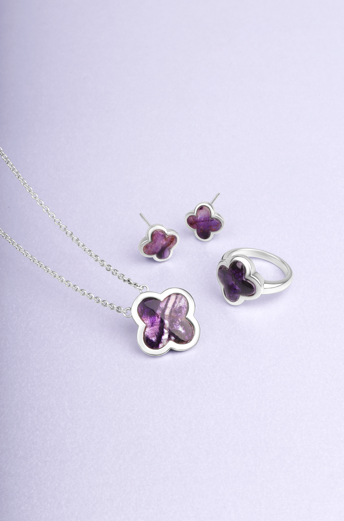 This elegant ring features a stunning four leaf clover shaped cabochon of the finest Blue John stone, that has been sourced directly from the Derbyshire Blue John Cavern in Castleton. The striking Blue John forms a stunning contrast between the sterling silver, creating the perfect look for every occasion.