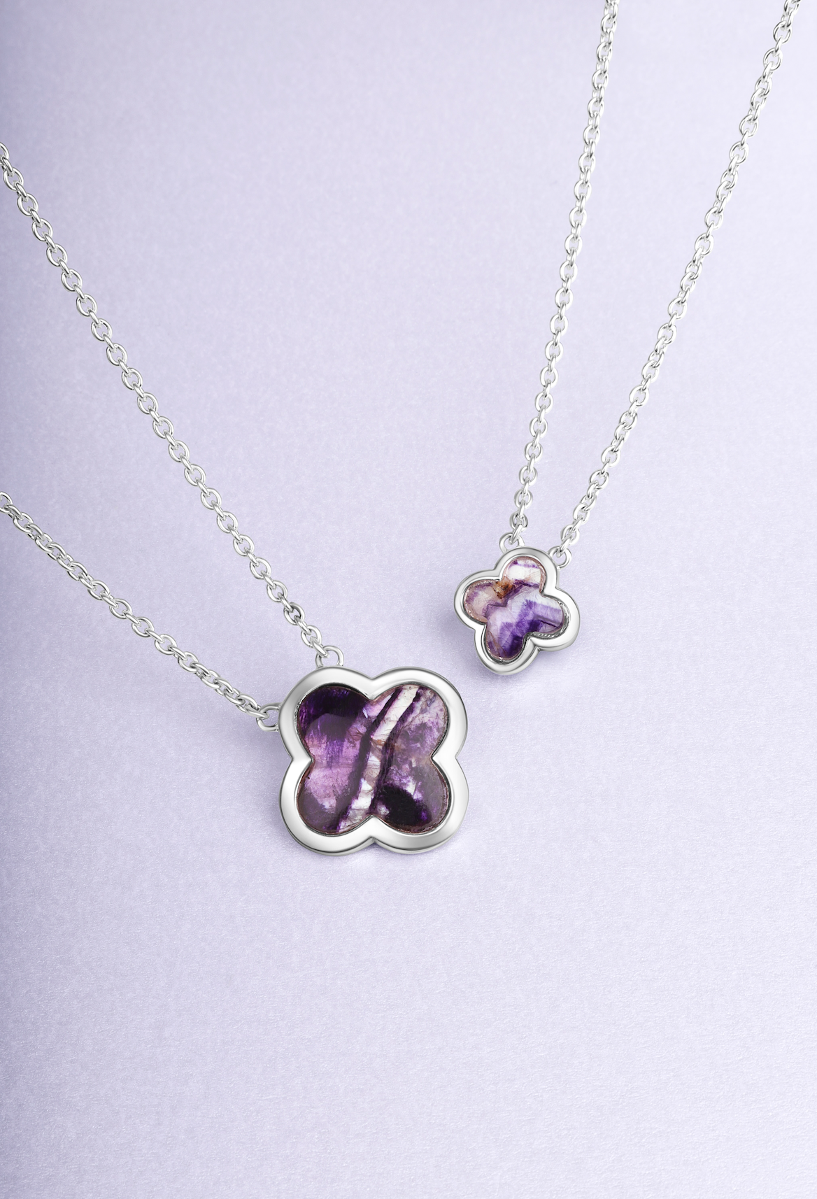 This elegant necklet features a stunning four leaf clover shaped cabochon of the finest Blue John stone, that has been sourced directly from the Derbyshire Blue John Cavern in Castleton. The clover is surrounded by a polished edge detail for a unique, stylish finish. The striking Blue John forms a stunning contrast between the sterling silver polished frame, creating the perfect look for every occasion. Presented on an 18 inch long sterling silver chain.