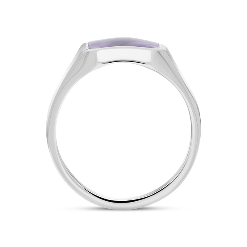 This classic signet style ring features a stunning hand carved Blue John stone, sourced directly from Castleton, Derbyshire. The gemstone is inlaid within a solid band of sterling silver. The finished piece is smooth and highly polished.