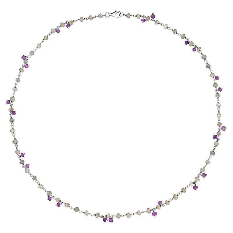 This Labradorite and Amethyst necklace features gemstones of approximately 4mm, hand woven onto sterling silver chain. A perfect gift for someone special. Length: 16 inches.