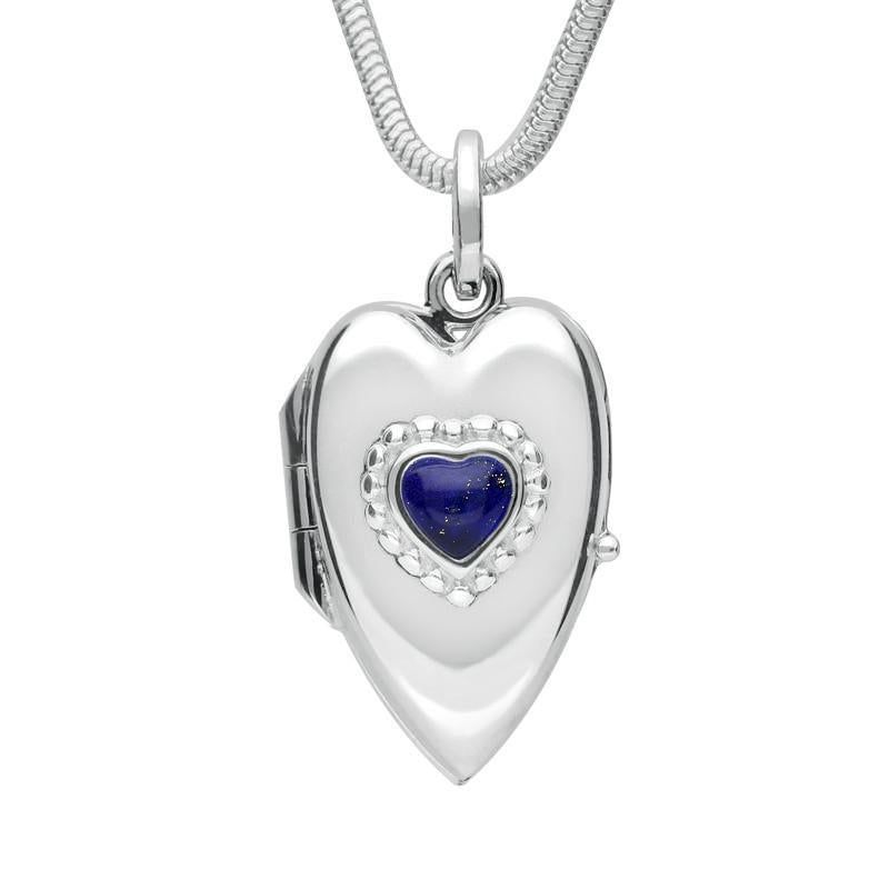 Sterling Silver Lapis Lazuli Beaded Edge Heart Locket Necklace. P2104.