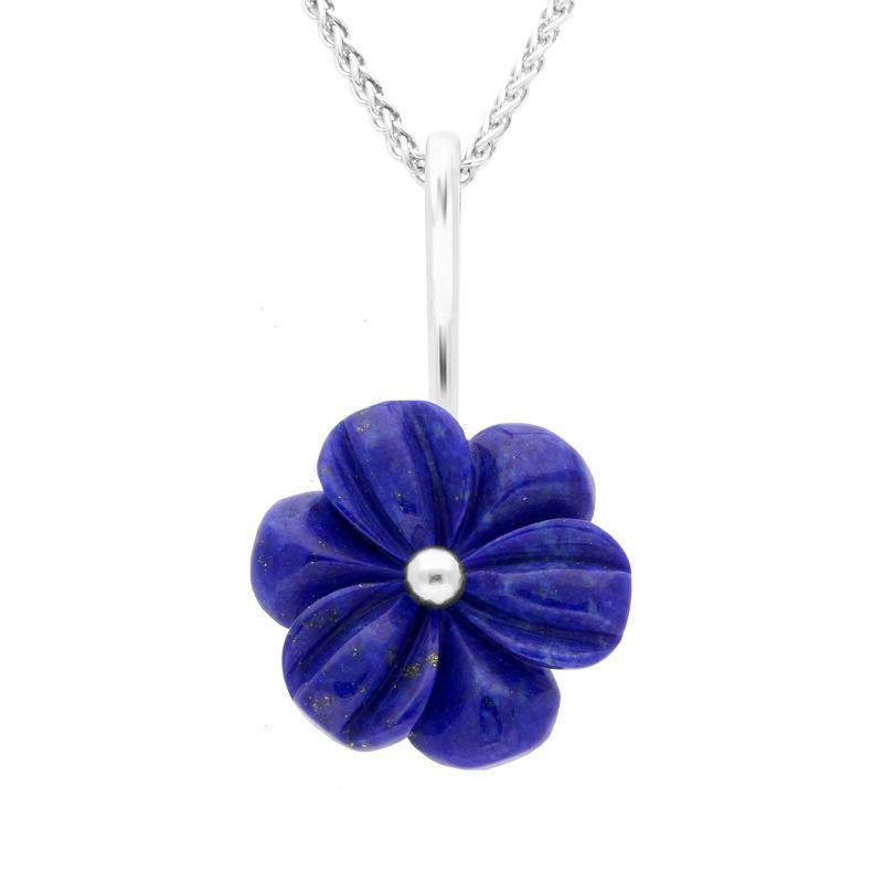 This feminine necklace is part of our Tuberose handmade jewellery collection and features a delicate hand crafted piece of Lapis Lazuli. The gemstone has been cut and carved in a unique and detailed dahlia design, to showcase the natural beauty of the Lapis, which is held from a sterling silver bail and completed by an 18" sterling silver chain.