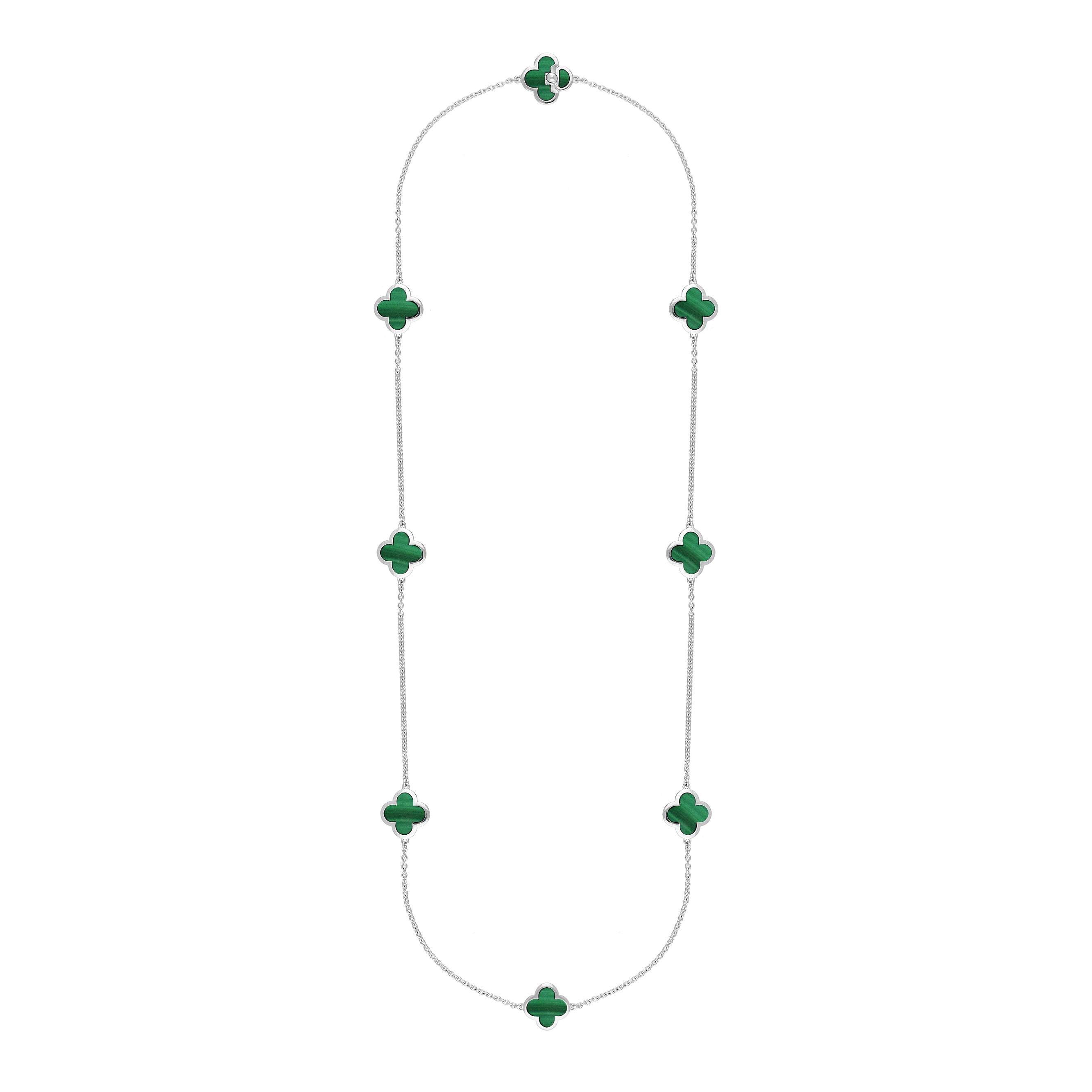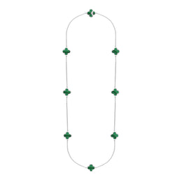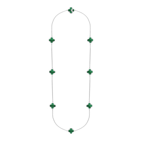 This elegant necklace features eight stunning four leaf clover shaped cabochons of the finest green Malachite stone. The striking Malachite forms a stunning contrast between the sterling silver creating the perfect look for every occasion. Length: 30 inches. Malachite clover diameter: 15mm.