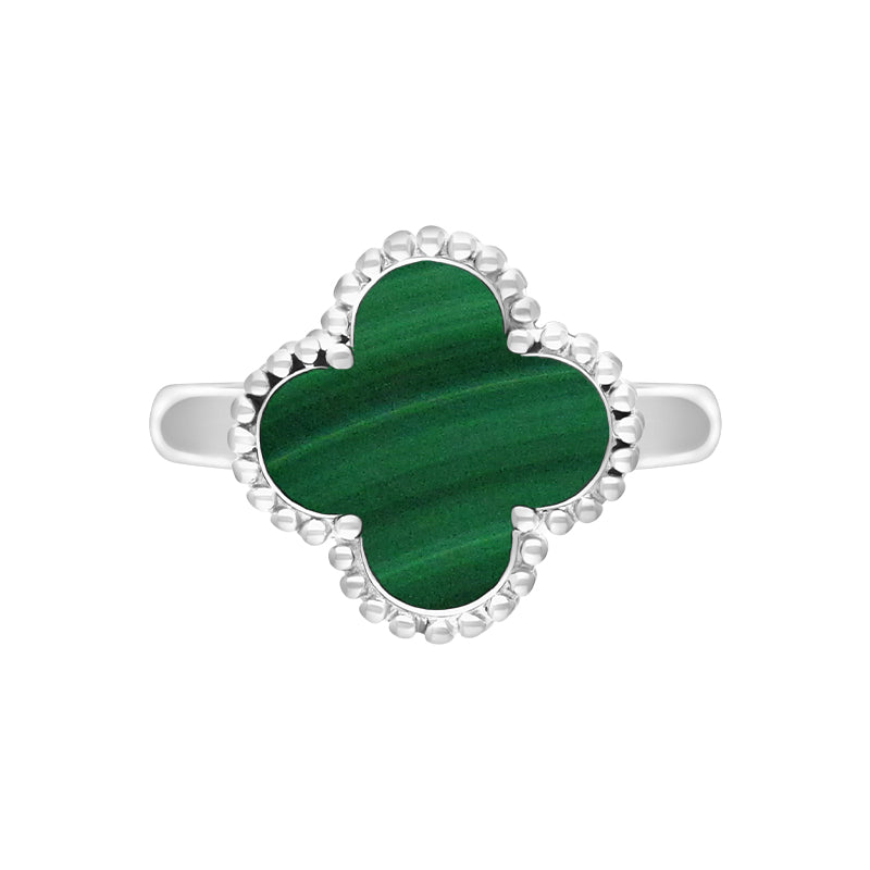 This elegant ring features a stunning four leaf clover shaped cabochon of the finest green Malachite. The clover is surrounded with a ball edge detail for a unique, stylish finish. The striking Malachite forms a stunning contrast between the sterling silver ball edge frame, creating the perfect look for every occasion.