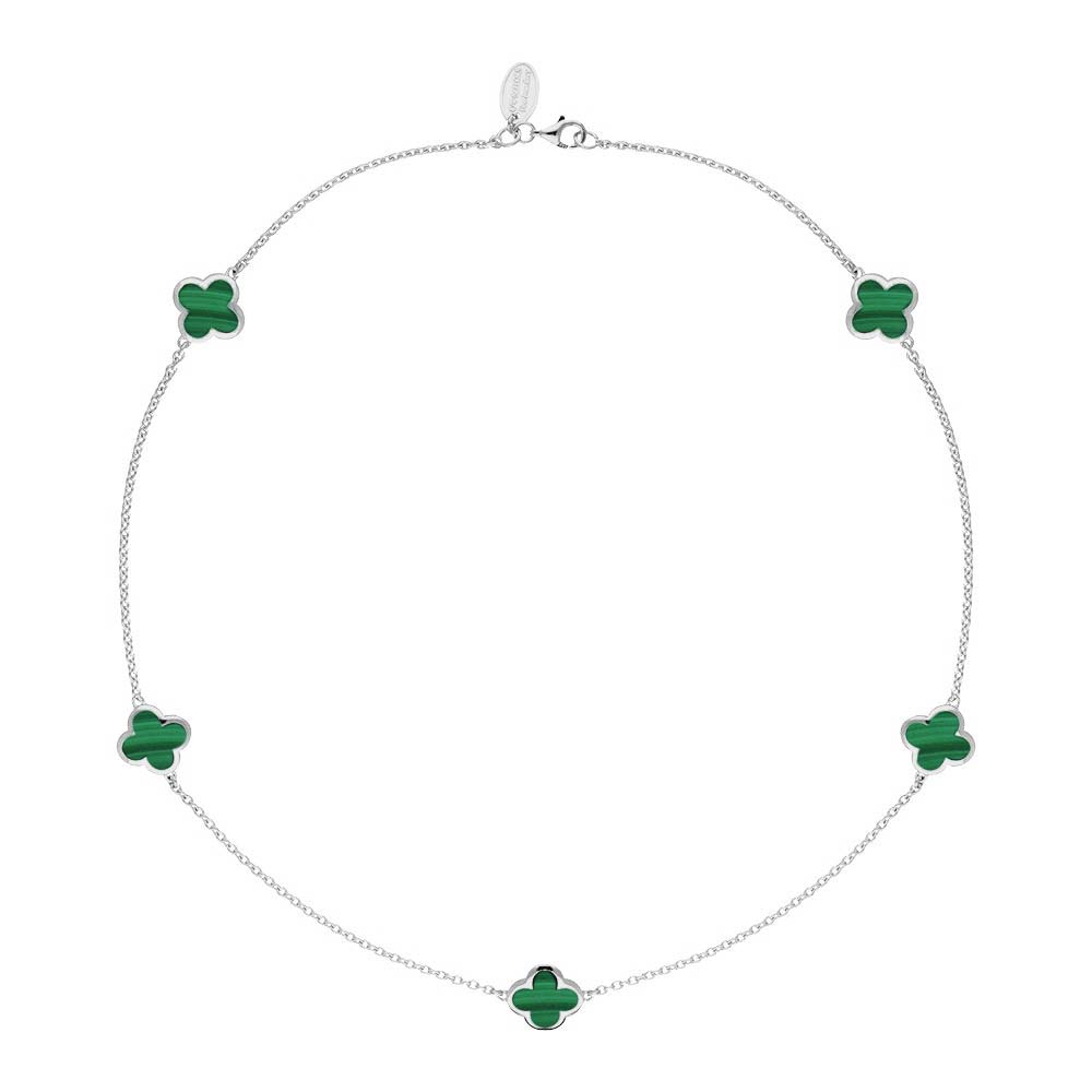 This elegant necklace features five stunning four leaf clover shaped cabochons of the finest Malachite stone. The striking gemstone forms a stunning contrast between the sterling silver chain, creating the perfect look for every occasion.