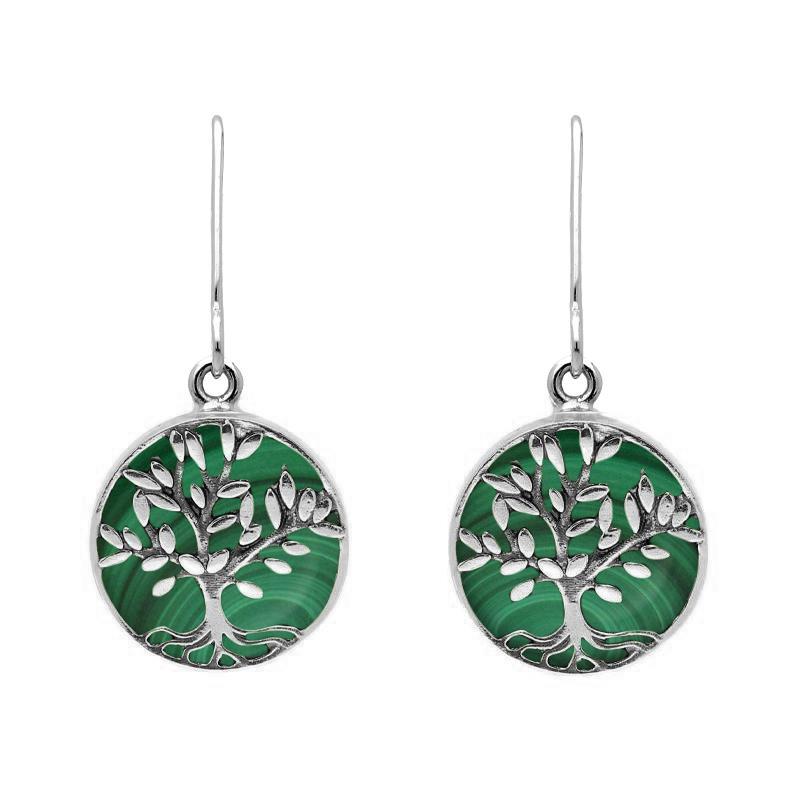 Sterling Silver Malachite Round Large Tree of Life Leaves Drop Earrings - E2427 (TOL-186)