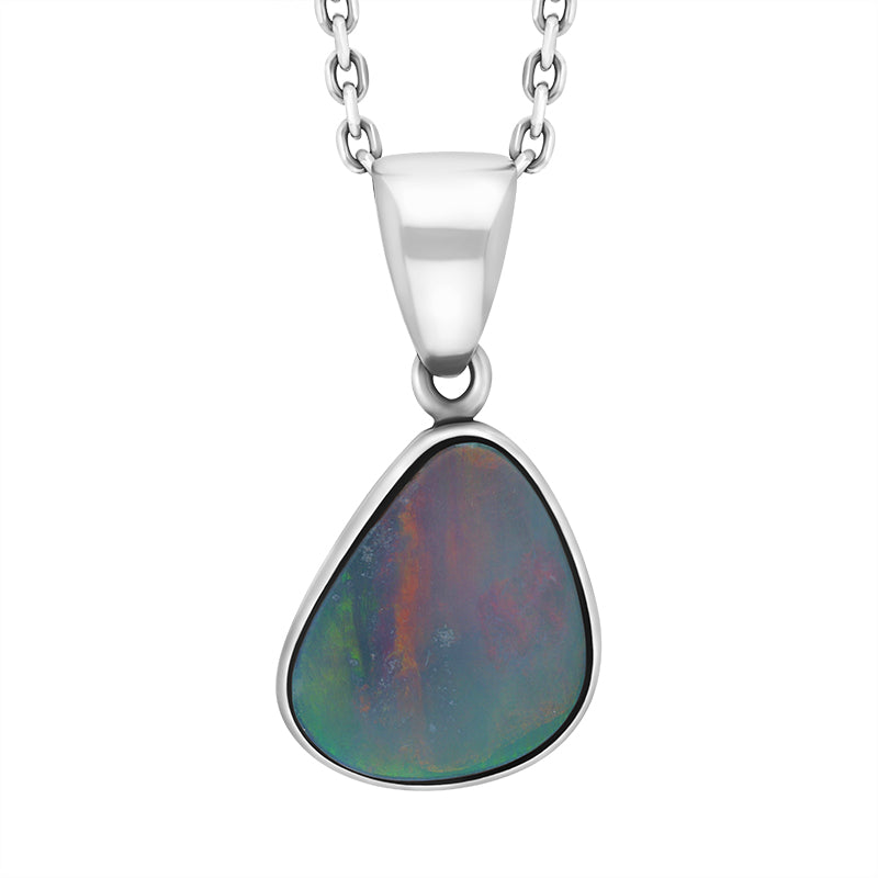 A sophisticated and classic pendant, featuring an abstract iridescent Opal gemstone presented on a 18" long sterling silver chain.