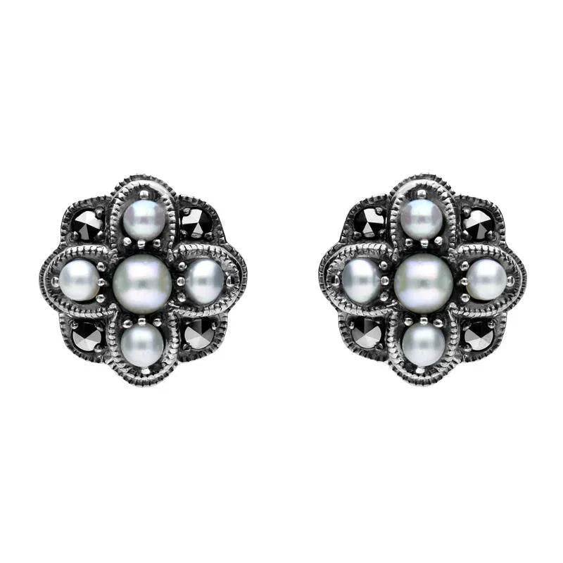 Sterling Silver Pearl and Marcasite Four Petal Flower Stud Earrings