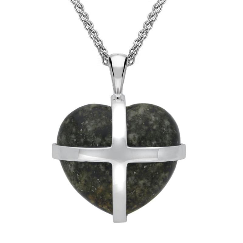 A medium sized signature heart shaped piece of hand-carved and polished Preseli Bluestone held by a cross of sterling silver laid over the heart. The pendant is presented on an 18 inch sterling silver chain which loops through an elegant fixed bale at the top of the heart. Dimensions: 21mm x 22mm.