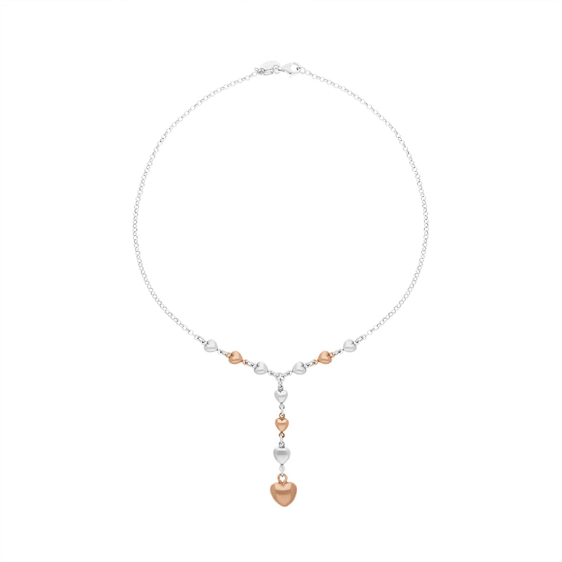 This charming necklace features an elegant arrangement of alternating sterling silver and rose gold plated sterling silver hearts. Perfect for any occasion.