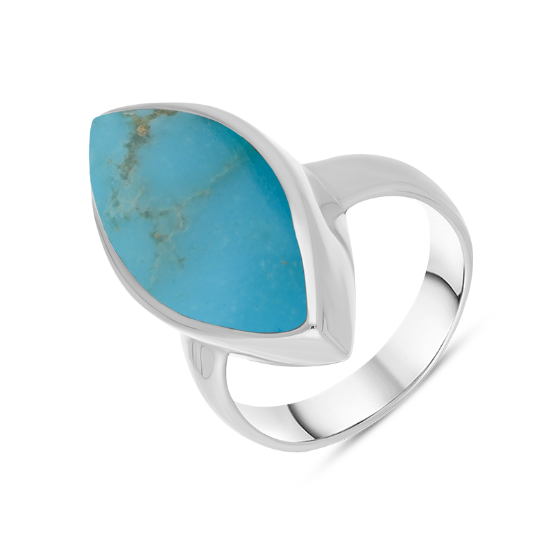 A classic, chunky marquise shaped sterling silver andTurquoise ring. The hand polished marquise shaped Turquoise gemstone sits proudly, making this ring a flattering shape for a multitude of fingers and a popular style choice. This genuine Turquoise gemstone has been sourced directly from the Kingman mine in Arizona.