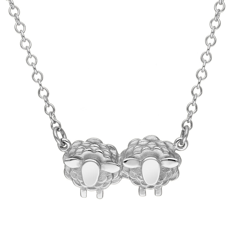 This unique necklace features a pair of adorable sheep, each with a polished sterling silver face. The necklace is completed with a sterling silver chain which fastens with a classic bolt ring style clasp.