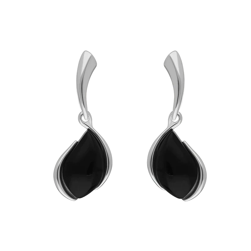 These feminine earrings feature two abstract pear shaped cabochons of the finest Whitby Jet, sourced directly from the north east coast of Yorkshire.The stones are framed sterling silver and are suspended below sterling silver twists. These striking earrings are perfect for everyday wear and are secured with post and butterfly fitments.