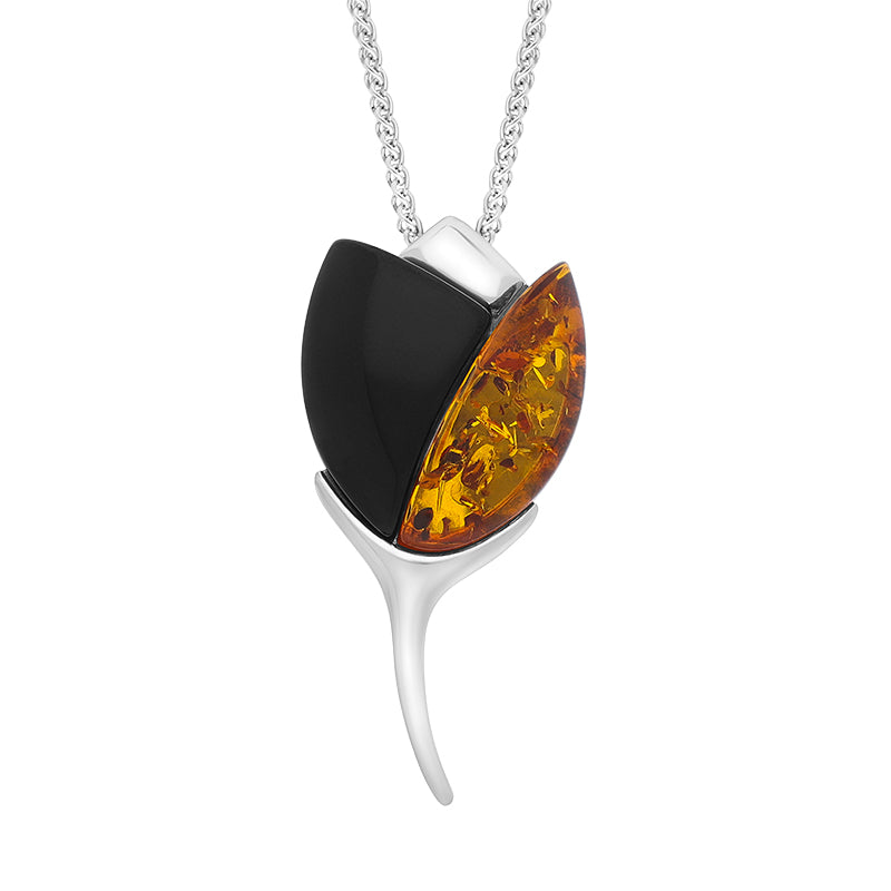 A perfect gift, this necklace features an two stone leaf design, set with hand carved Whitby Jet and Amber gemstones upon the leaf. Complete in a sterling silver design, the two stones perfectly complement the piece.