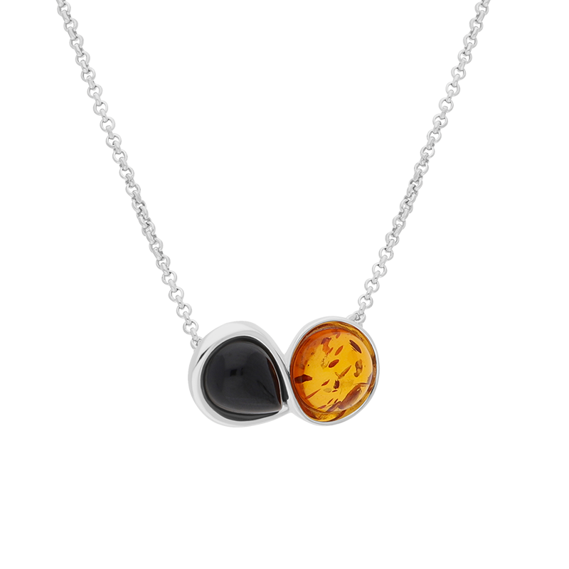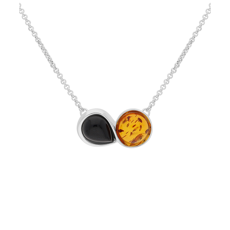 This versatile necklace features genuine Whitby Jet and Amber framed in Sterling Silver. This feminine necklace is perfect for everyday wear and is presented on an 18'' long Sterling Silver chain with a classic lobster clasp for easy wear.