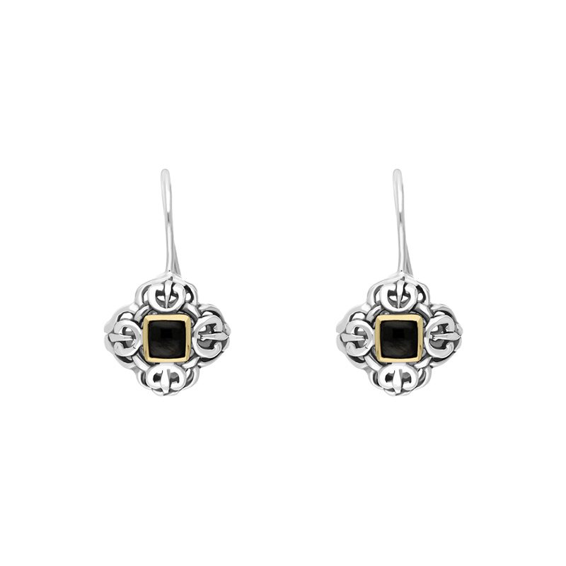 These charming sterling silver earrings, with 18ct yellow gold embellishments, feature the finest Whitby Jet sourced directly from the north east coast of Yorkshire. The striking Whitby Jet creates a stunning contrast between the sterling silver making the perfect earrings for someone looking for a beautifully unique item of jewellery.