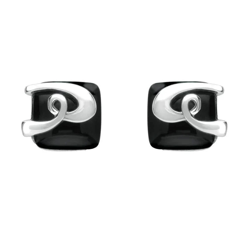 These elegant earrings feature two stunning cushion shaped cabochons of the finest Whitby Jet stone, sourced directly from the north east coast of Yorkshire. The stones are placed in delicate sterling silver swirl frames for a striking finish. The beautiful sterling silver earrings are perfect for everyday wear and are easily secured with butterfly and post fastenings.