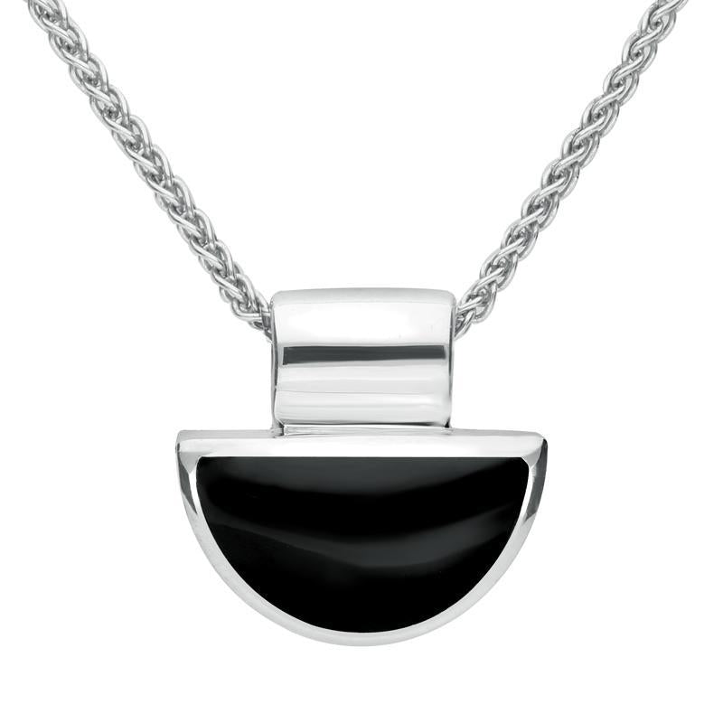 A classic, half moon shaped pendant, solidly backed with sterling silver and set with hand polished Whitby Jet. A static sterling silver bail gives this piece a contemporary look. This pendant is supplied on an 18 inch sterling silver chain.