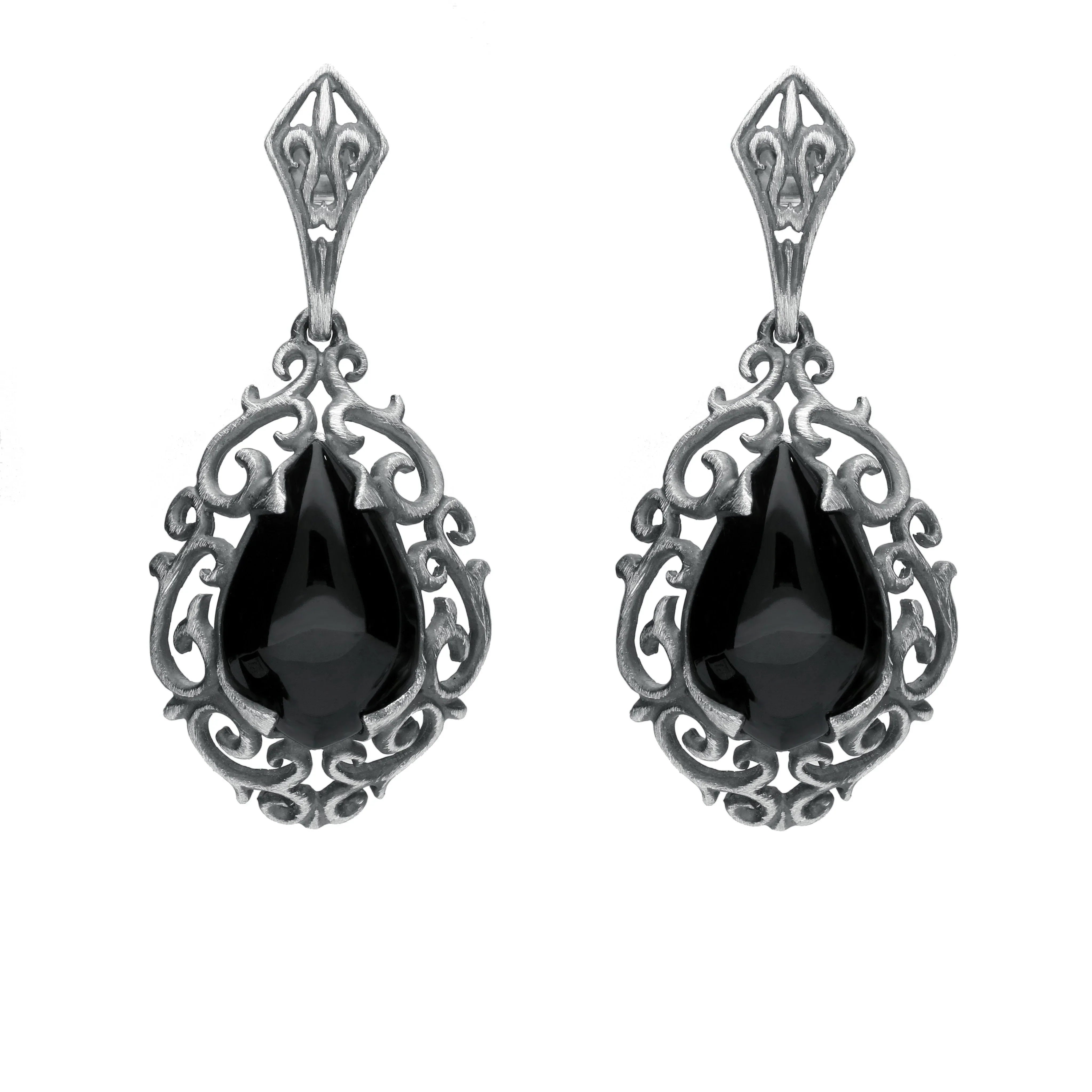 These exquisite earrings feature two stunning pear shaped cabochons of the finest Whitby Jet stone, sourced directly from the north east coast of Yorkshire. The stones are placed in ornate sterling silver scroll frames for a beautiful finish. The striking sterling silver earrings are easily secured with butterfly and post fastenings.