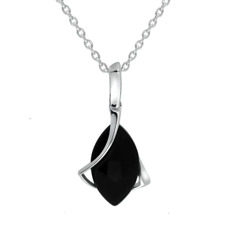 This stunning necklace features a classic marquise shaped Whitby Jet gemstone set in an open twisted sterling silver frame, sourced directly from the North East coastline of Yorkshire. Complete on an 18 inch sterling silver chain with a classic bolt ring style clasp, this necklace is the perfect gift for any occasion.