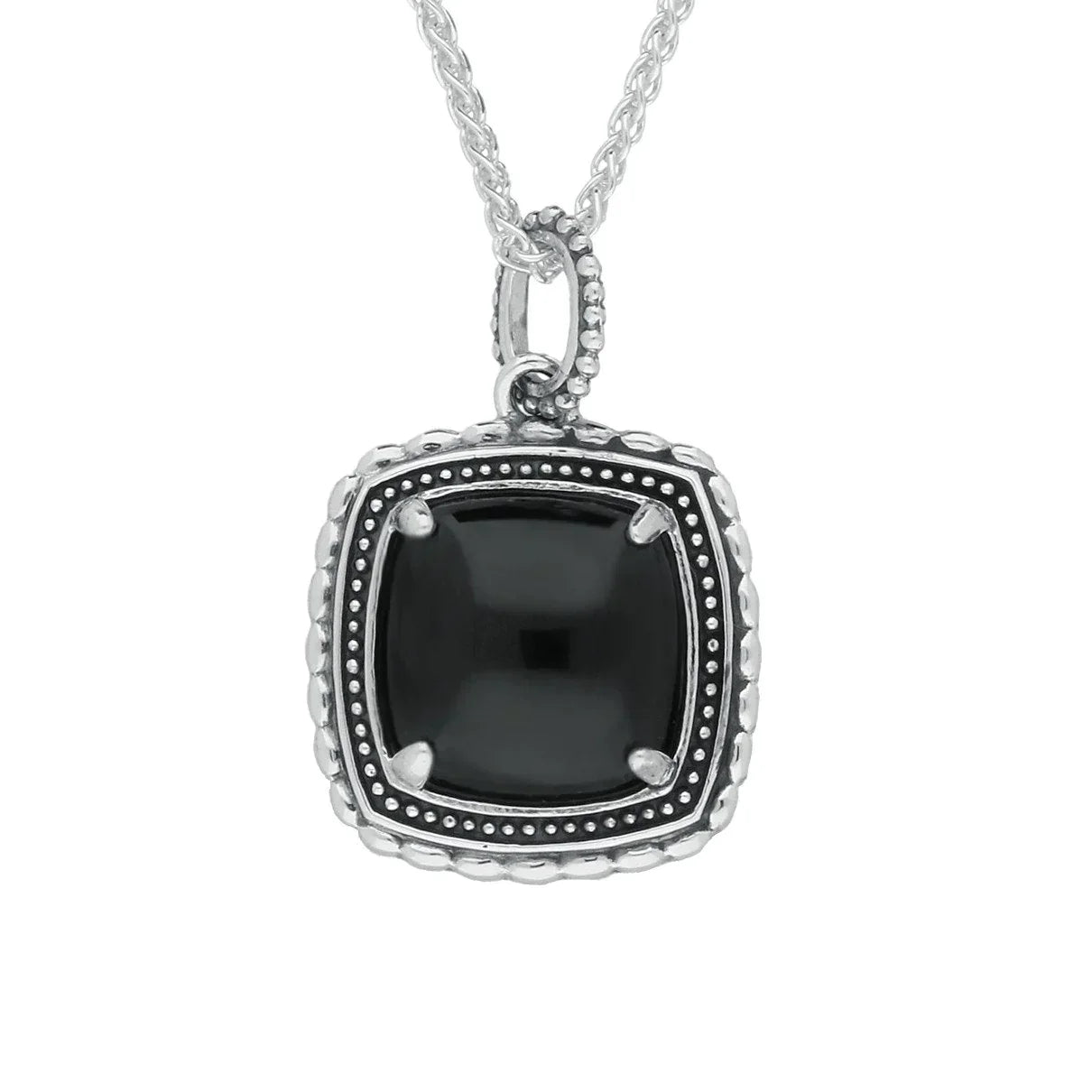 This elegant necklace features a stunning cushion shaped cabochon of the finest Whitby Jet stone, sourced directly from the North East coast of Yorkshire. The Jet is placed within an oxidised sterling silver rope frame for a beautiful finish. The striking sterling silver pendant hangs gracefully from a beaded bail on a fluid 18 inch long sterling silver chain complete with a classic bolt ring clasp for easy wear.