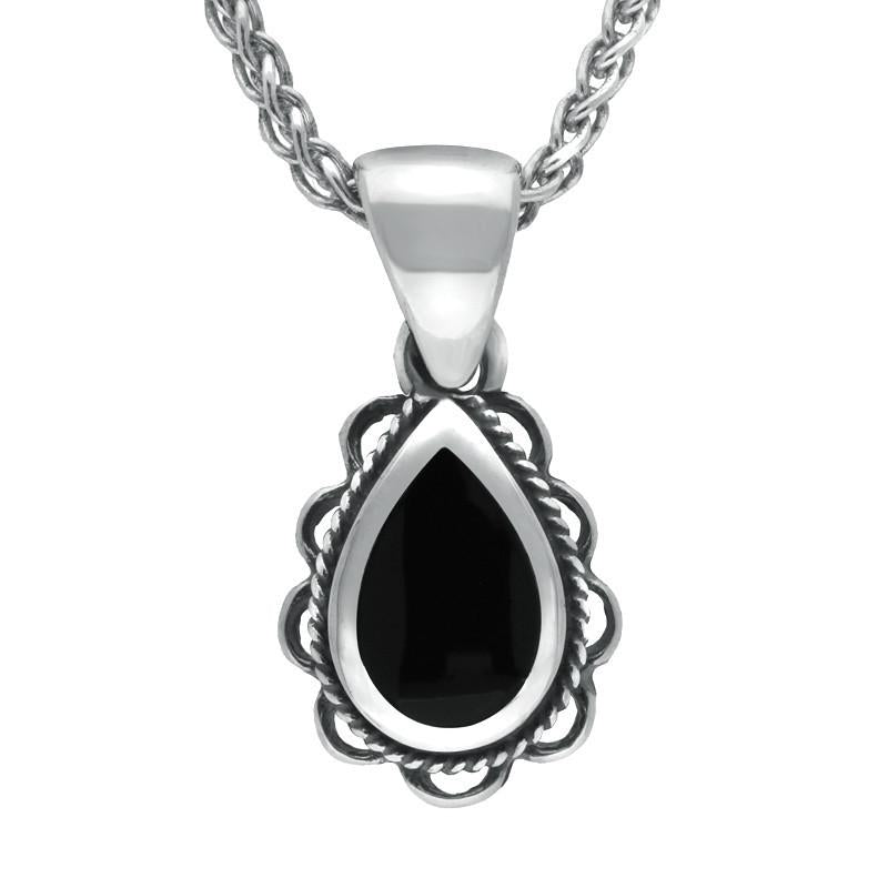 This pretty pendant presents a teardrop shape of hand carved Whitby Jet, sourced directly from the North East coast of Yorkshire and placed in a sterling silver setting. A tiny rope edge and detailed frill surrounding stone creates an beautiful imitation of petals on a flower. The pendant hangs gracefully from an 18 inch sterling silver chain, creating a necklace that looks beautiful on any occasion.