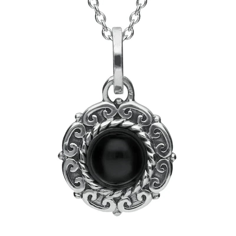 This elegant necklace features a stunning circular shaped cabochon of the finest Whitby Jet stone, sourced directly from the north east coast of Yorkshire. The Jet is placed within an ornate sterling silver frame for a beautiful finish. The striking sterling silver pendant hangs gracefully from a fluid 18 inch long sterling silver chain complete with a classic bolt ring clasp for easy wear.