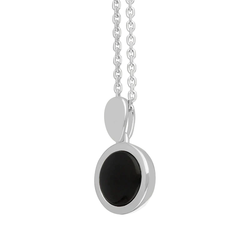 This necklace features a stunning round shaped cabochon of the finest Whitby Jet stone, sourced directly from the North East coast of Yorkshire. The striking sterling silver pendant hangs gracefully from a fluid 18 inch long silver chain complete with a classic bolt ring clasp for easy wear.