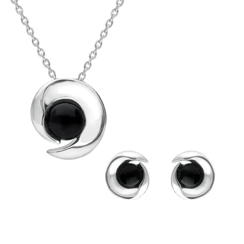 Sterling Silver Whitby Jet Round Spiral Two Piece Set