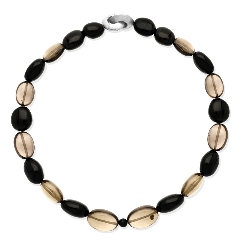 This unique necklace features genuine Whitby Jet and Smokey Quartz beads. Perfect for day to evening wear, the necklace is completed with a decorative sterling silver clasp.