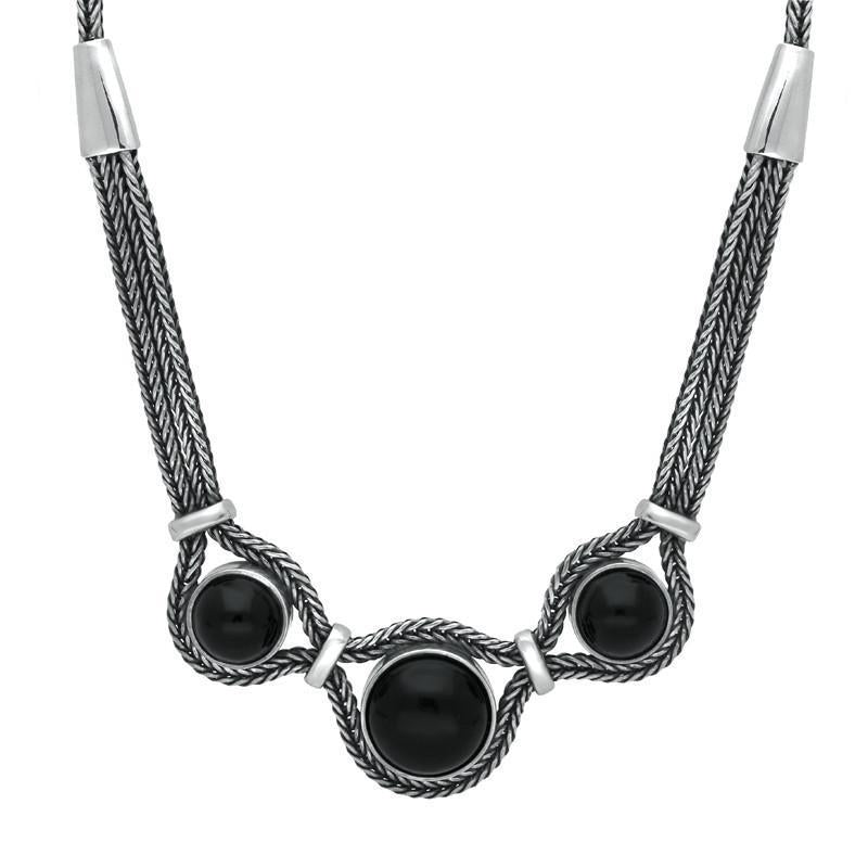 This eye-catching necklace is part of our Foxtail collection and features three circular shaped cabochons of the finest Whitby Jet stone, sourced directly from the North East coast of Yorkshire. Each is framed within a sterling silver foxtail rope chain for a beautiful, unique finish. The statement necklace fastens with a classic bolt ring clasp for easy wear.