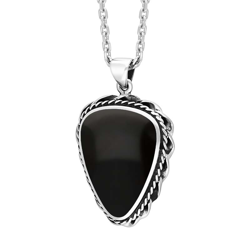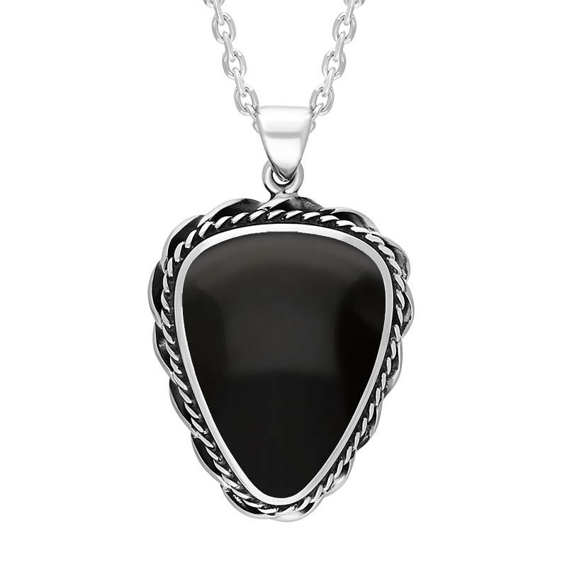 This elegant necklace boasts a stunning rounded triangle cabochon of the finest Whitby Jet stone, soured directly from the North East Coast of Yorkshire. The Whitby Jet stone is set within a twisted rope, sterling silver frame for a contemporary finish. The necklace hangs gracefully from an 18 inch sterling silver chain which is completed by a classic bolt ring clasp for easy wear.