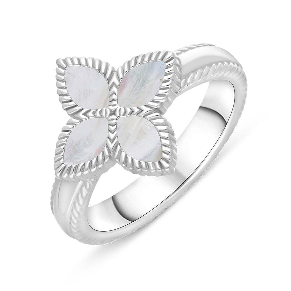 This elegant ring features four stunning marquise shaped cabochons of the finest Mother of Pearl in the shape of a flower. The flower is surrounded with a rope edge detail for a unique, stylish finish. The striking Mother of Pearl forms a stunning union between the sterling silver rope edge frame, creating the perfect look for every occasion.