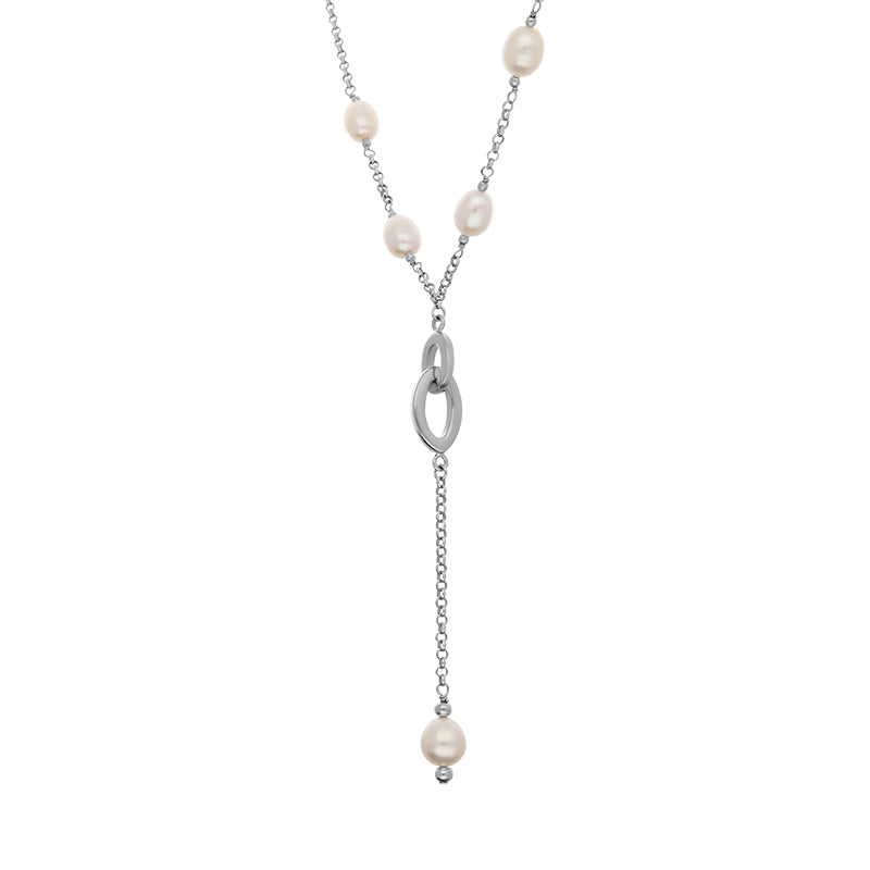 This stunning necklace features five, oval shaped, white pearls; delicately strung together on a Sterling Silver link style chain. A classic and beautiful addition to any jewellery collection, perfect for every day wear. Necklace length: 17 inches.