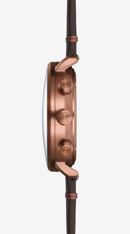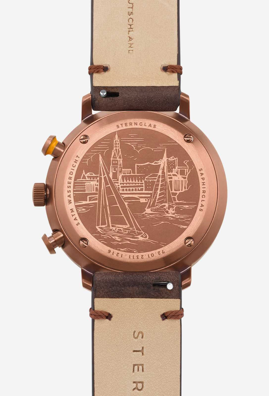 Sternglas Watch Hamburg Chrono Green Bronze S01-HC35-VI17. For a long time STERNGLAS watches have been asked for a swimming and diving watch. Several prototypes later Sternglas can now present their first timepiece in this distinctive style. In order to achieve a particular high water resistance the case back and the crown are screwed. The watch case is manufactured using high quality steel.
