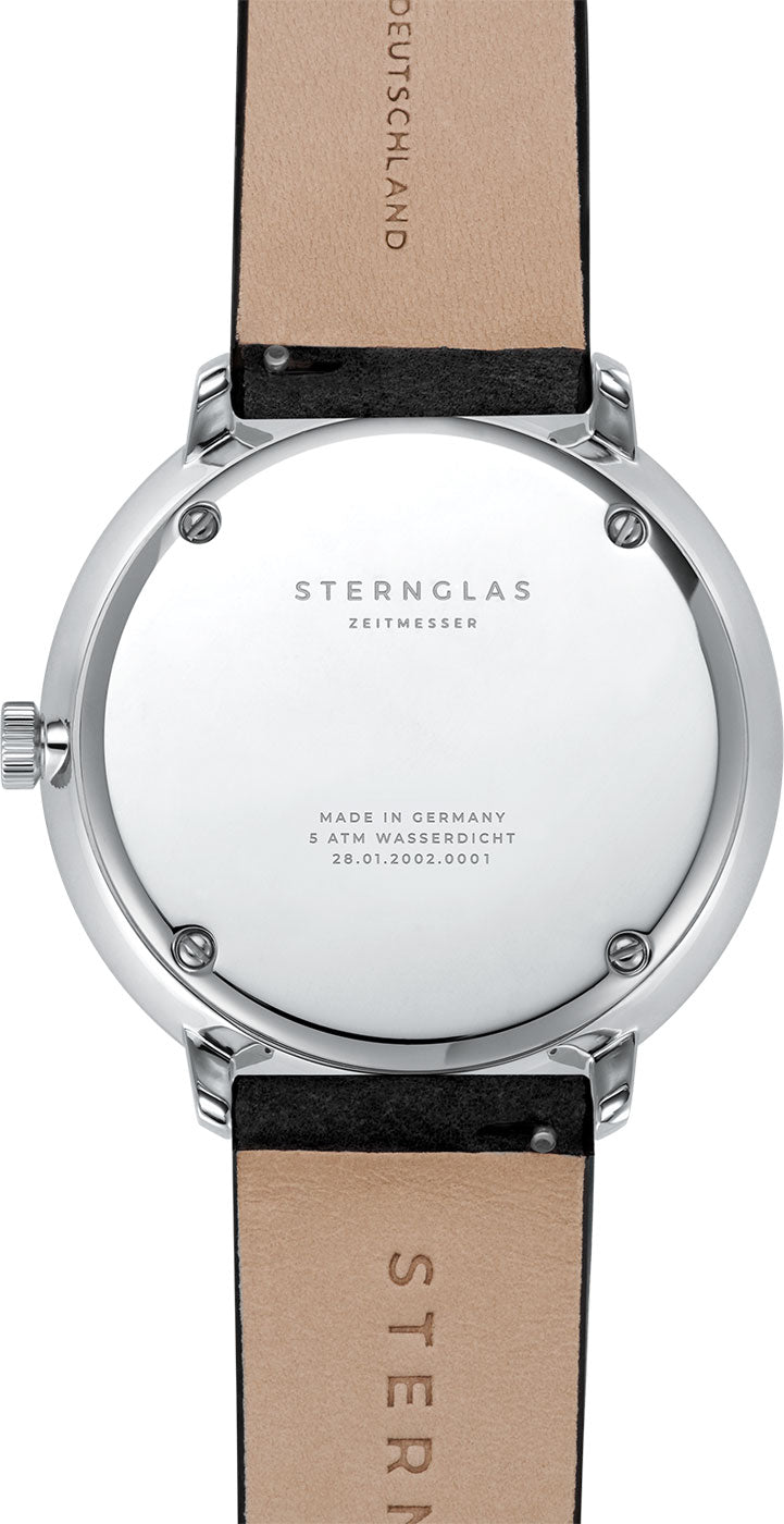 Sternglas Watch Hamburg Quartz Leather S01-HH11-VI15. For a long time STERNGLAS watches have been asked for a swimming and diving watch. Several prototypes later Sternglas can now present their first timepiece in this distinctive style. In order to achieve a particular high water resistance the case back and the crown are screwed. The watch case is manufactured using high quality steel and equipped with Sapphire Glass. As a visual highlight you find on the reverse an engraving of an abstracted seabed.
