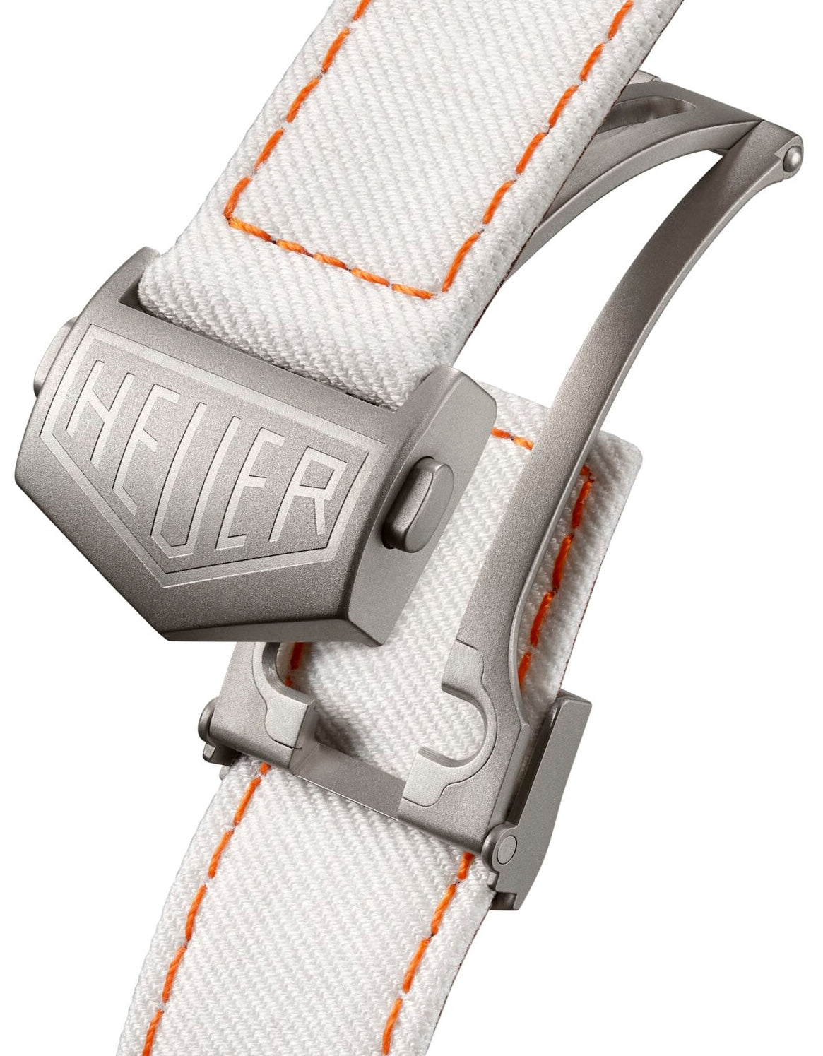 TAG Heuer Monaco Chronograph x Gulf Limited Edition Watch CAW218G.EB0393. Drawing from Steve McQueen’s legacy, the TAG Heuer Monaco Chronograph x Gulf celebrates racing with its titanium case, Gulf logo, and iconic blue and orange stripes. Equipped with the Calibre 11, a heritage strap inspired by McQueen’s suit in the movie “Le Mans, and an additional navy blue-grained calfskin leather strap, this limited-edition watch honors motorsport history.