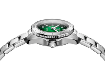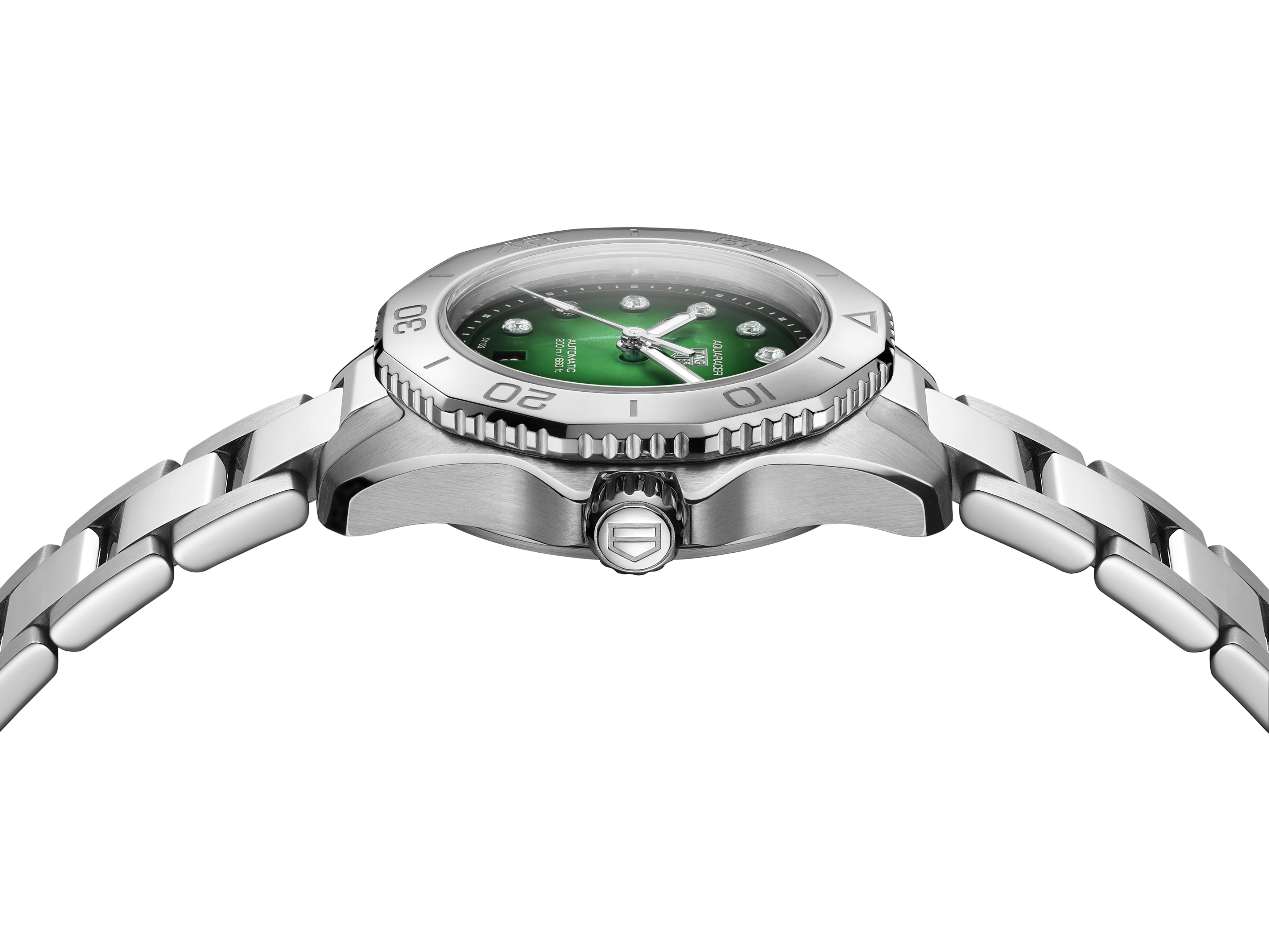 This lady’s TAG Heuer Aquaracer Professional 200 watch, dressed in green tones and scintillating diamonds, is an elegant sporty luxe companion that is powered by a quartz movement. The diamond dive watch features a black date window at 6 o’clock and envelops the wrist with an equally robust stainless steel bracelet with links in polished and brushed finishes.