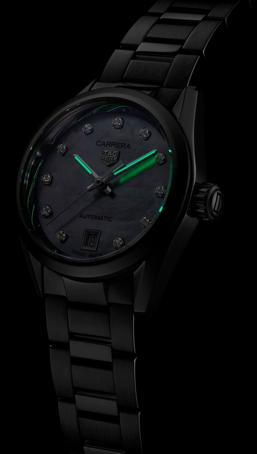 This breathtaking TAG Heuer Carrera Ladies watch perfectly balances the line between sporty and sophisticated with a hint of femininity that can only be matched by the elegance of its wearer. It’s mesmerising combination of luxury materials like mother of pearl and diamond make it unmissable on the wrist while the high performing Swiss Made automatic winding movement reminds us that appearance is only the beginning.