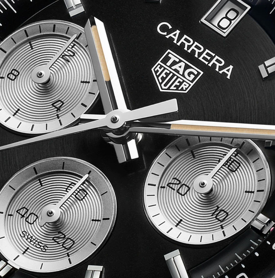 - Black dial with silver filled chronograph sub counters